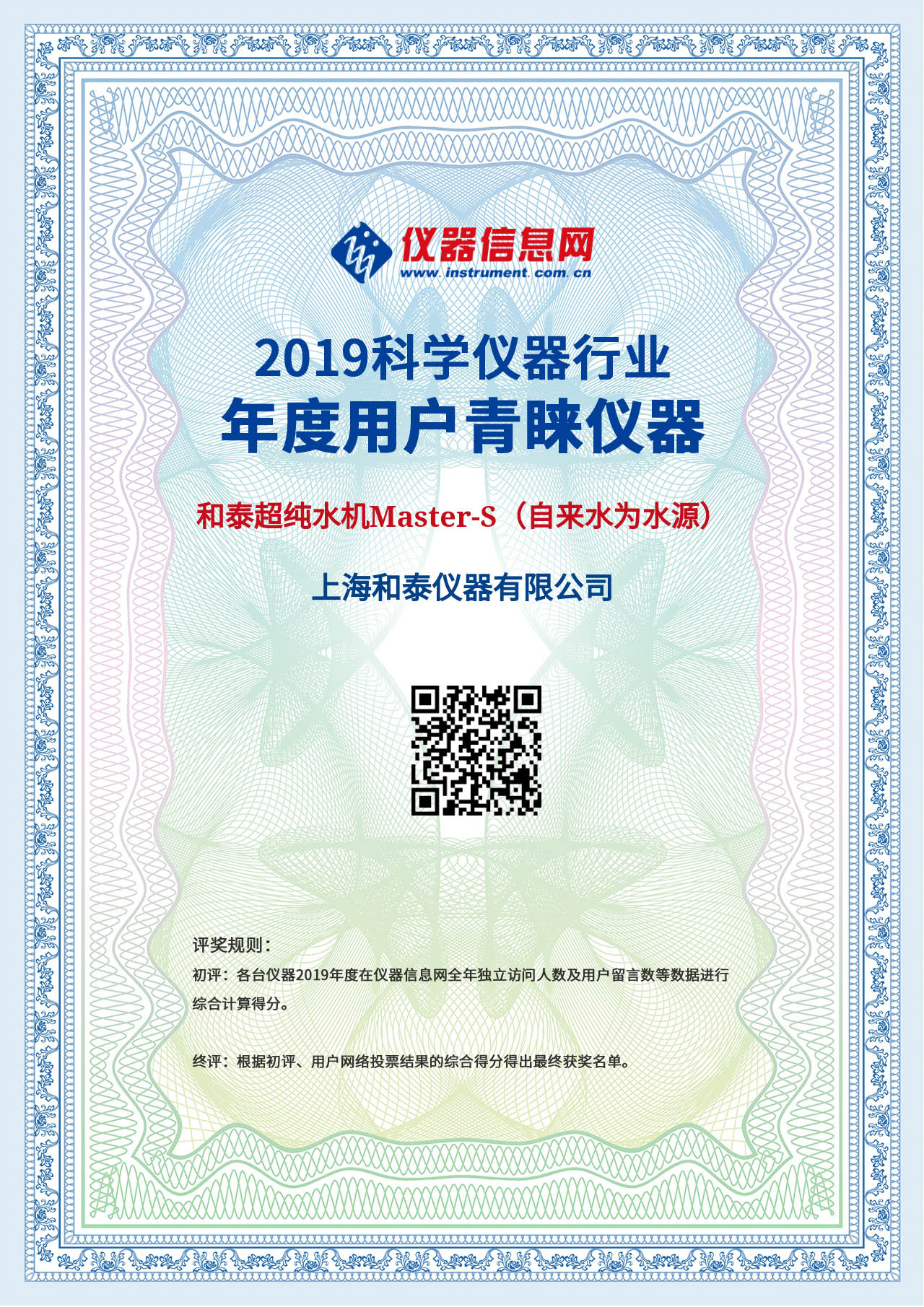 和泰實驗室純水系統憑借強大的品牌影響力、出色的產品競爭力、全面的市場占有率、良好的客戶口碑榮獲2019“科學儀器行業年度用戶青睞儀器”(純化類)大獎!