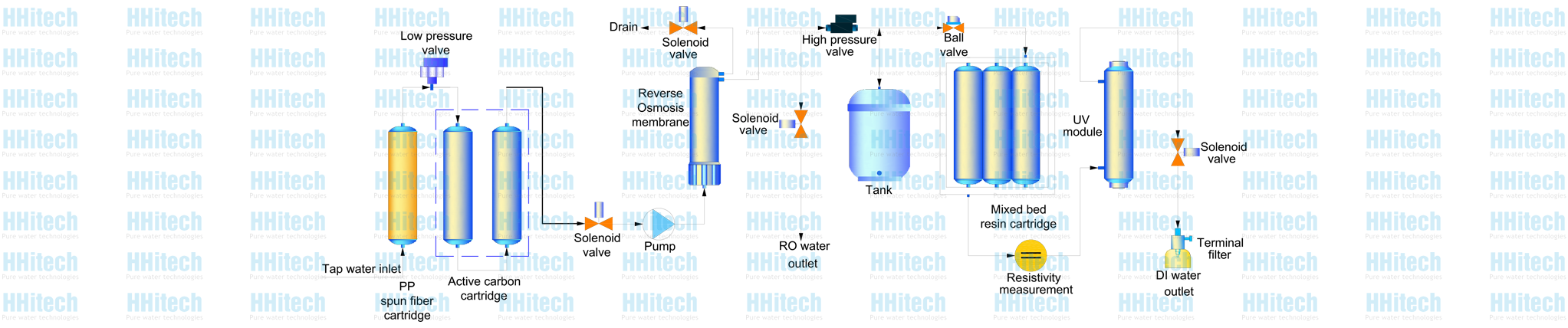Main body (Including 1 set of cartridge)+15 liters pressure tank+ TDS/conductivity test pen |