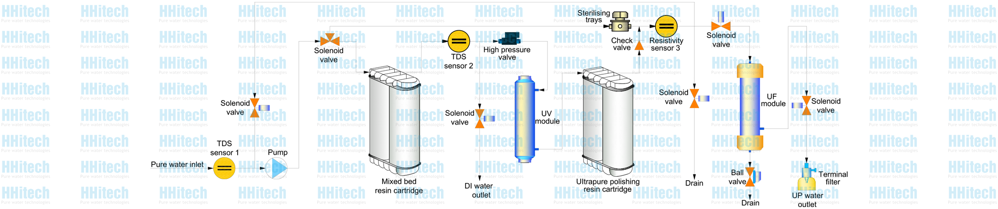 With pure water or distilled water inlet, its output is up to 2 liters/minute. It can produce deionized water and ultrapure water. The deionized water’s resistivity is above 16MΩ.cm, and the ultrapure water’s resistivity absolutely reaches to 18.2MΩ.cm. It completely meets the highest grade I standard of ASTM, CAP, CLSI, EP and USP.