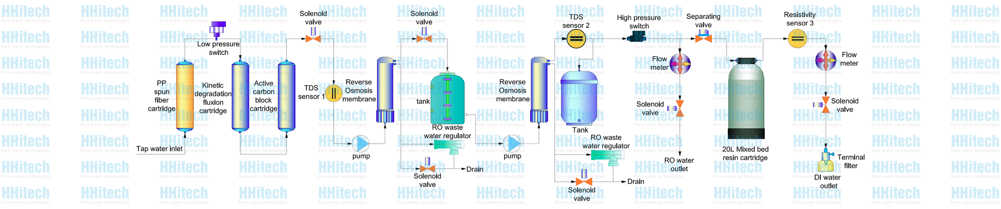 Standard configuration Main body (Including 1 set of cartridge)+built-in 20 liters PE tank and 20 liters pressure tank