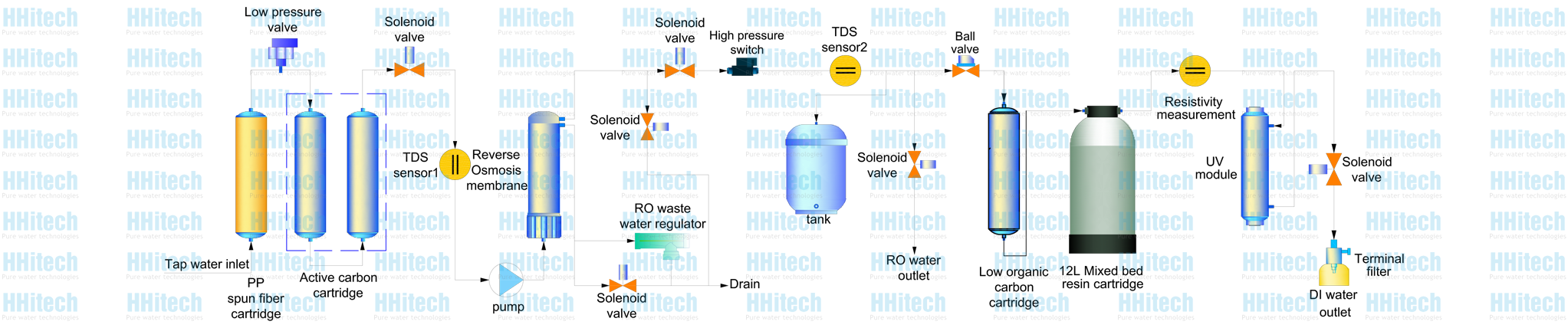 With tap water inlet, its output ranges from 45 to 125 liters/hour. It can produce single stage RO water and deionized water. The single stage RO water’s ion rejection rate is more than 97%, and the deionized water’s resistivity is more than 10MΩ.cm, near to18.2MΩ.cm. It completely meets the requirements of general chemical or biological experiments for pure water.