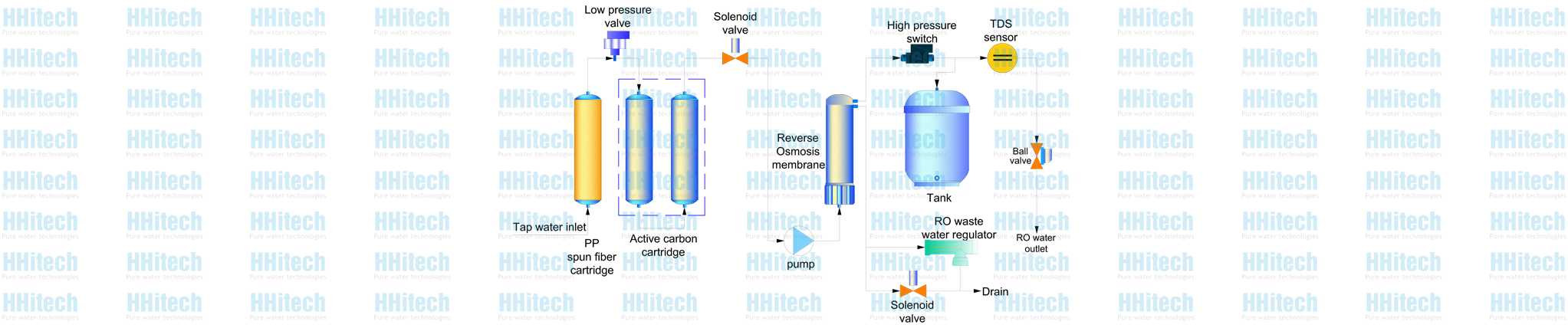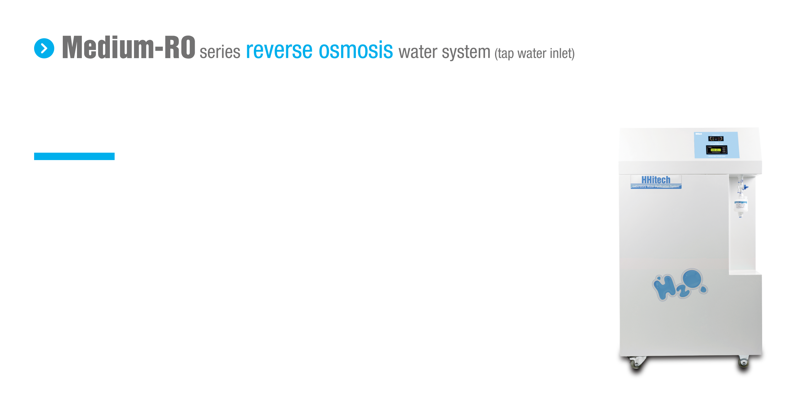 With microcomputer controlling system in LED display, stainless steel shell, built-in 2 set pressure tanks, single stage RO system, 1 pump, portable TDS test pen and on-line conductivity monitor, Medium-RO series reverse osmosis water system is economic choice of RO water’s mass usage for general glassware washing.