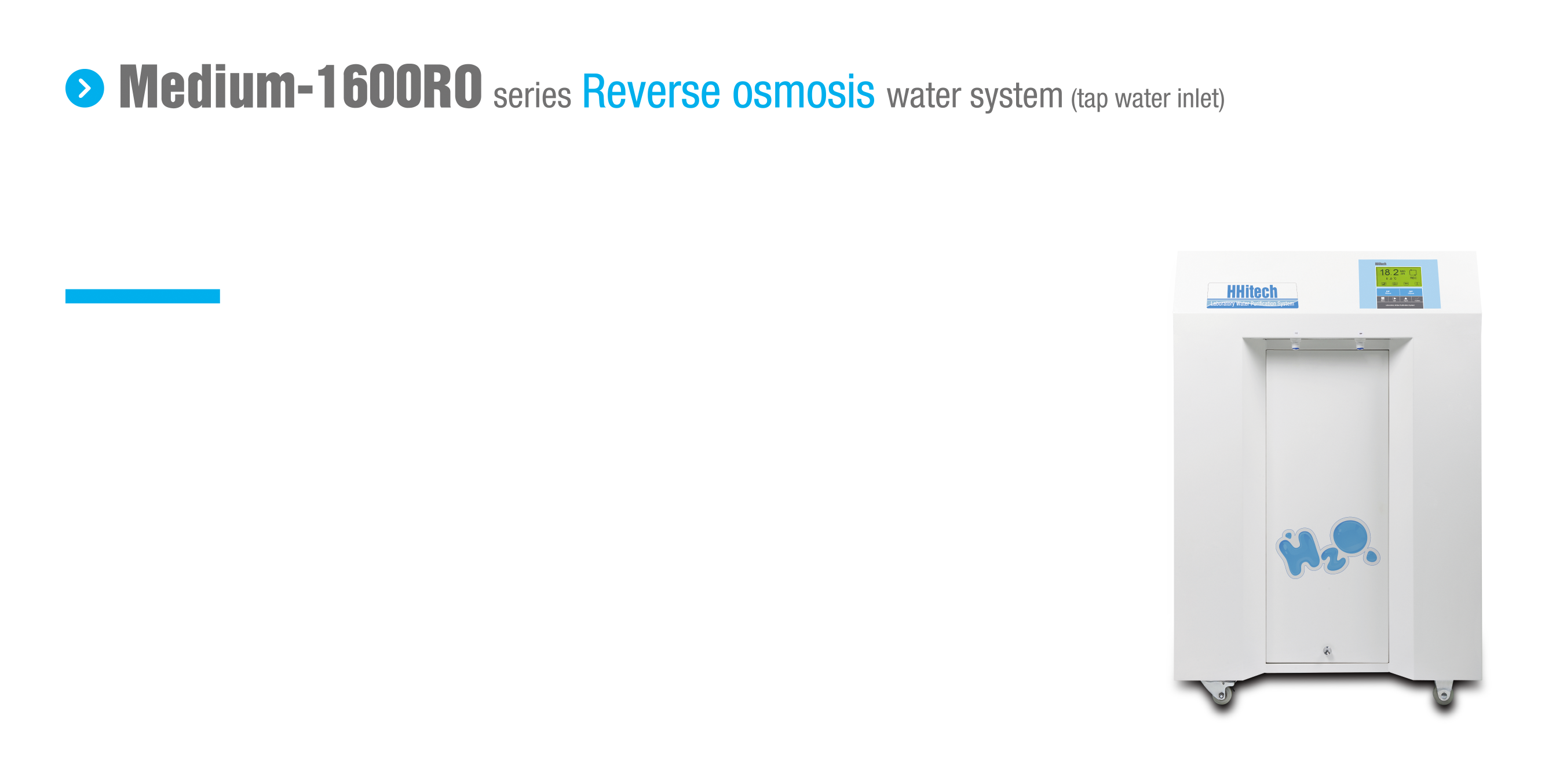 Medium-1600RO is single stage RO water system, with LCD controlling system, 3 way water quality sensor, timing and quality dispensing, stainless steel shell. The single stage RO water’s ion rejection rate is more than 97% (new RO membrane), organic rejection rate>99% (when mw>200 Dalton), particles and bacteria rejection rate>99%. It is suitable for glassware washing and general grade experiments.