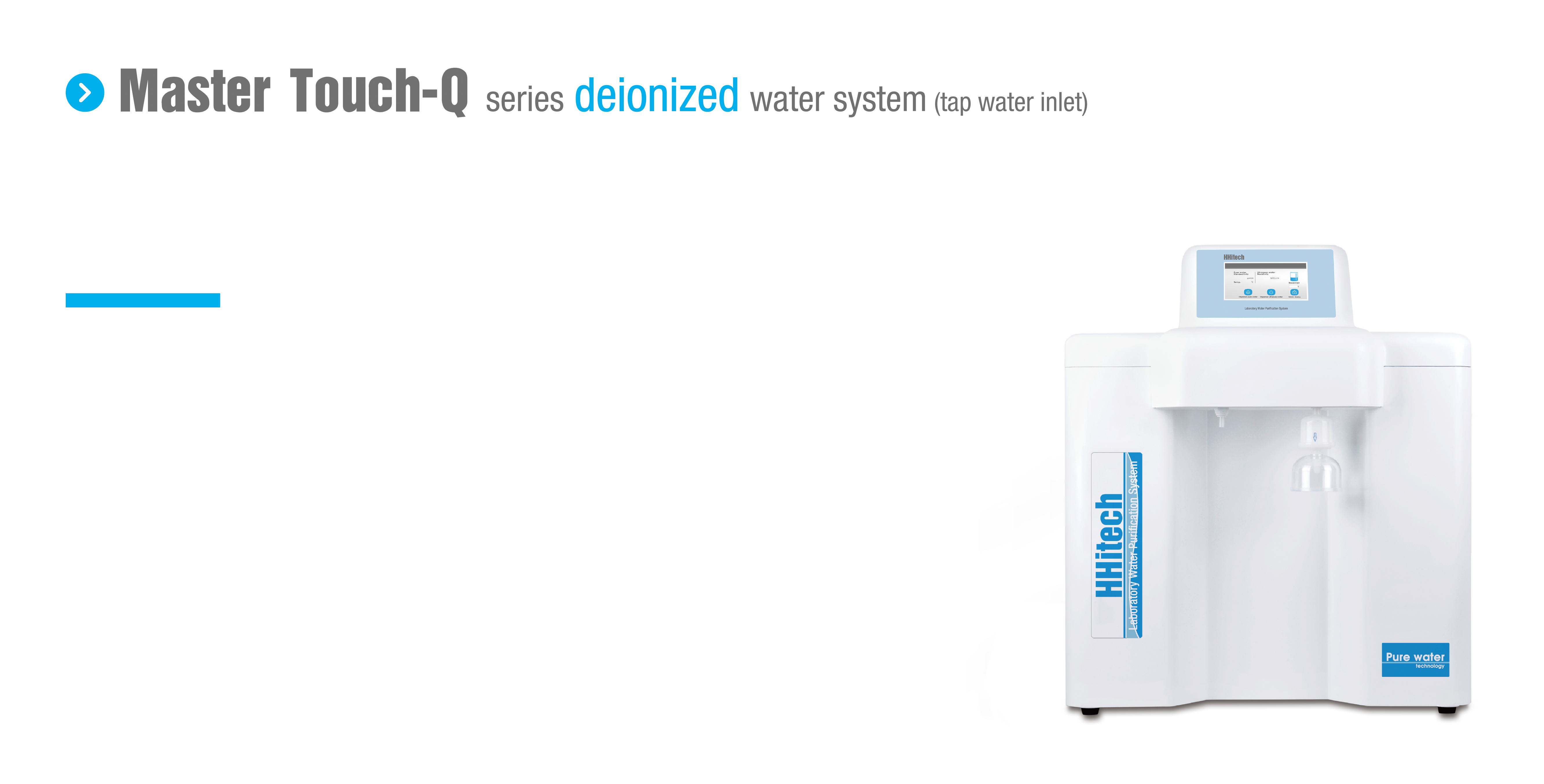 With 5.0 inch touch screen system, 3 way water quality sensor, 2 way flow sensor for quantified dispensing, single stage RO system and 1 pump, Master Touch-Q series deionized water system is superior choice of deionized water for general grade experiments. With tap water inlet, its output ranges from 15 to 30 liters/hour. It can produce single stage RO water and deionized water. The single stage RO water’s ion rejection rate is more than 97%, and the deionized water’s resistivity is above 16MΩ.cm, near to18.2MΩ.cm. It completely meets the requirements of general chemical or biological experiments for pure water.