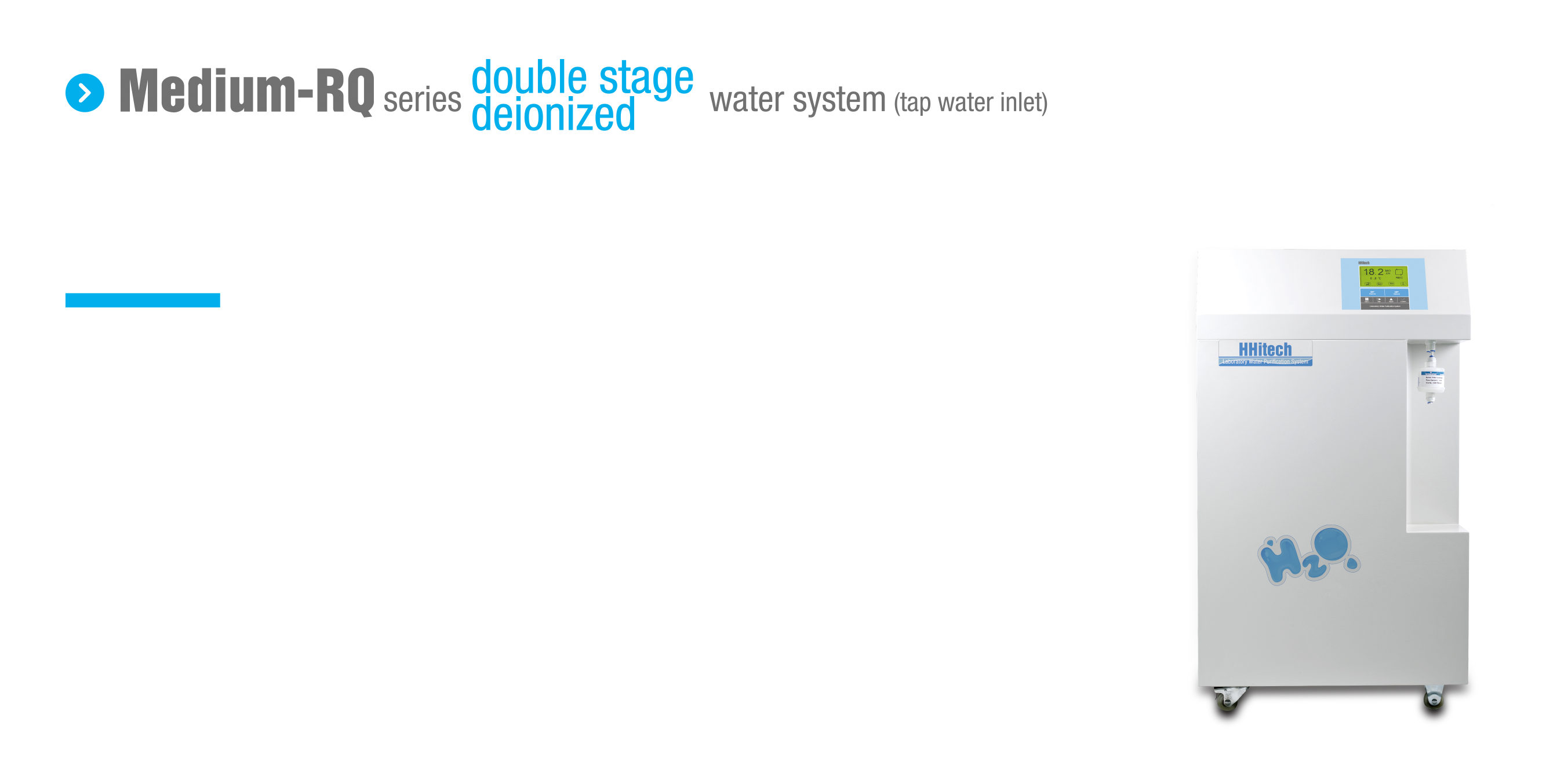 Medium-R series is standard double stage reverse osmosis system. With 2 stage pump, 2 stage RO membrane and buffer tank, system achieves stable water quality, little drain, and low running cost. Compared with single stage RO system, the quality of RO water is better, and the running cost is lower for less consumables replacement. Moreover, compared with simple 2nd stage RO system (1 pump, 2 RO membrane, without buffer tank), its system design is more rational, and the RO quality is more stable. Even though with the worse source water, the 2nd stage RO water’s conductivity also can stay 1-5μs/cm. Medium-RQ series is 2nd stage RO & deionized water system, with LCD controlling system, 3 way water quality sensor, timing and quality dispensing, stainless steel shell, built-in 2 set tanks (buffer tank and pressure tank). Its output ranges from 30 to 90 liters/hour. The 2nd stage RO water’s conductivity can stay 1-5μs/cm, and the deionized water’s resistivity is more than 10MΩ.cm, near to18.2MΩ.cm. It completely meets the requirements of general chemical or biological experiments for pure water.