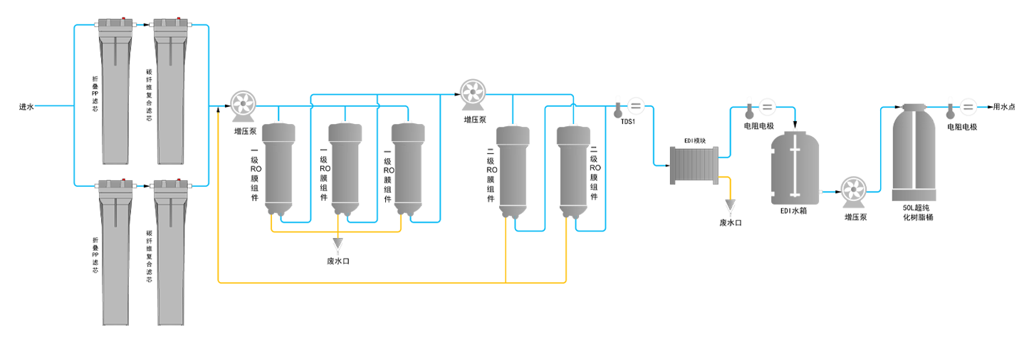 | 二級RO水 | 二級RO水離子截留率>99%(新RO膜),電導率 ≤5μs/cm; 有機物/顆粒/細菌截留率>99% | |