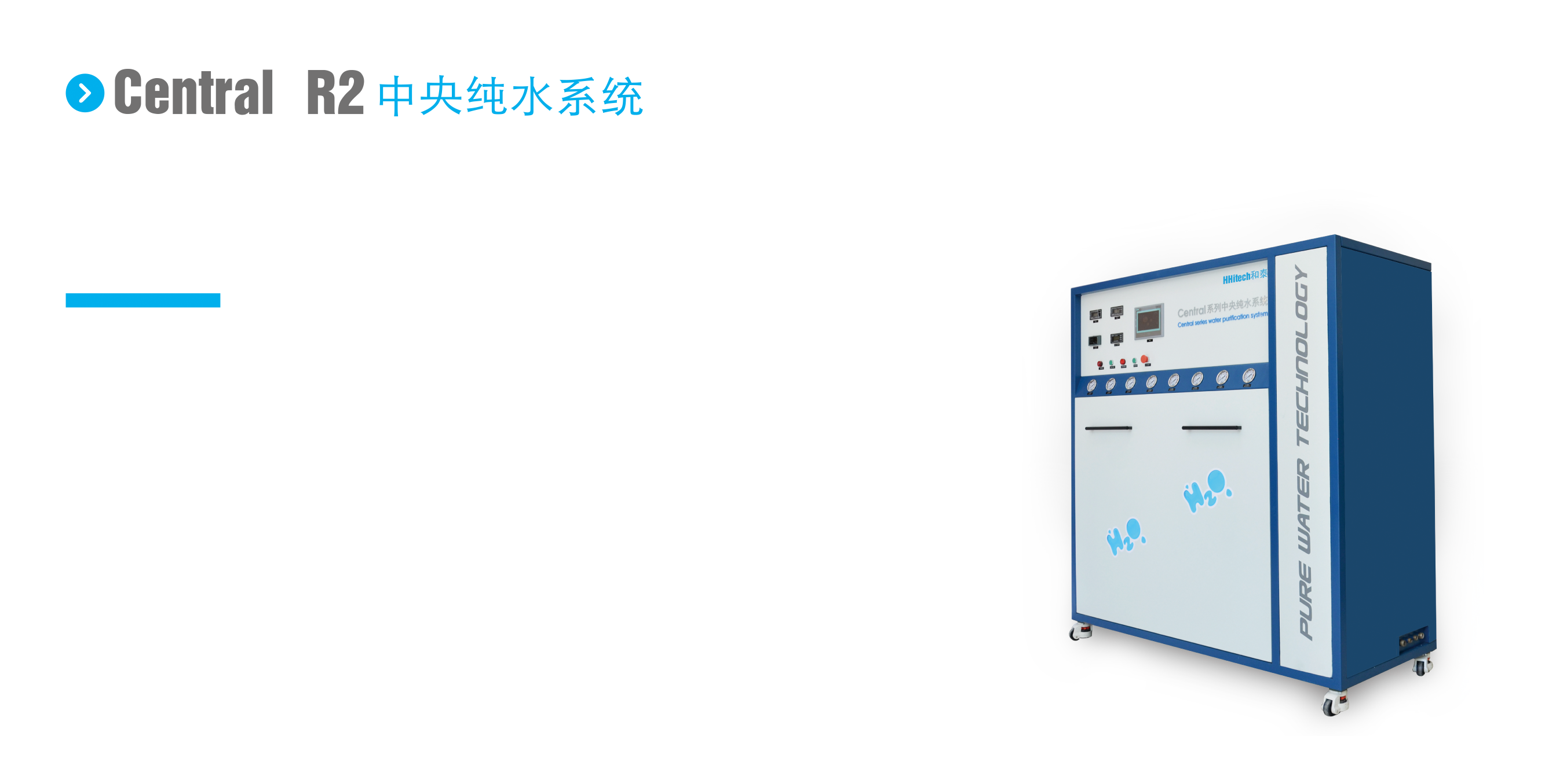 Central R2將預處理系統、二級RO反滲透系統、EDI模塊、150升不銹鋼RO水箱、280升不銹鋼EDI純水箱、純水輸送循環系統集成化于一體,整體化設計成為標準產品,有效避免因產品臨時選型設計導致的工作效率低下、系統元件堆疊、工藝不規范、產品粗獷以及占地面積大等問題。