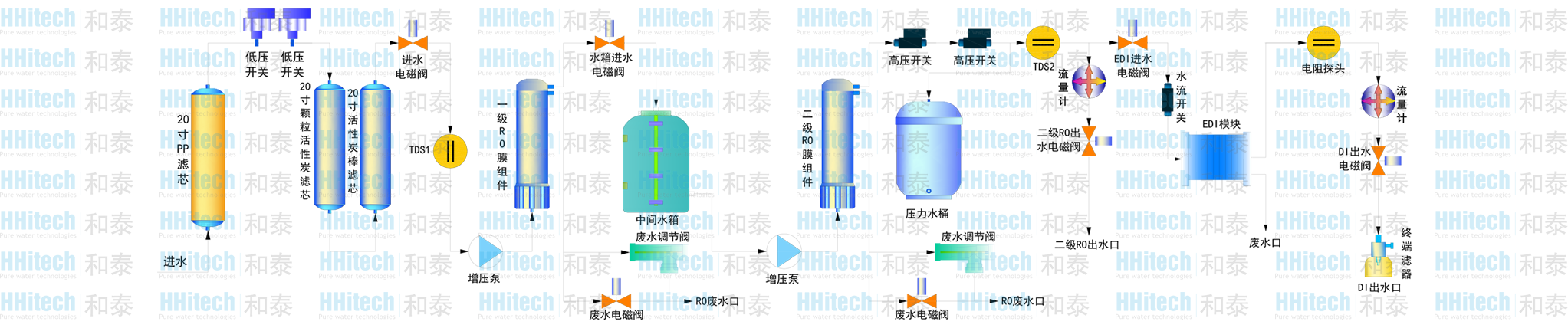 優化的標準雙級反滲透工藝,采用雙泵雙膜及過渡水箱,使系統能耗更低、廢水更少、產水質量更穩定。即使在源水水質較差的工況下,二級RO產水電導率同樣可穩定在1-5μs/cm。