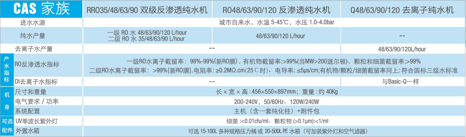 該系列以城市自來水為水源,為實驗室清洗設備配套定制,制造高質量R0反滲透水和雙級反滲透水、去離子水;該設備滿足實驗器具沖洗清洗、一般化學分析,檢測中心的常規用水,高壓滅菌鍋用。非常適合給生化儀、高低溫試驗箱、洗瓶機、恒溫恒濕箱等設備供水。Q系列產水優于GB/T6682-2008的一級水標準,二級RO水符合國標三級水標準,滿足絕大多數化學和生物類實驗用水的要求。